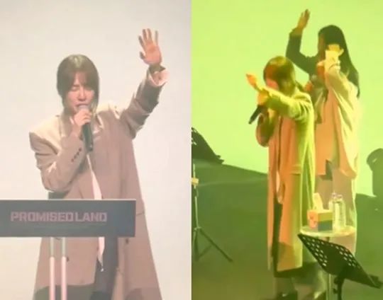 视频中尹恩惠闭眼拿着麦克风在台上大声祈祷,同时台下还站着无数的信徒跟着她一起举手回应。