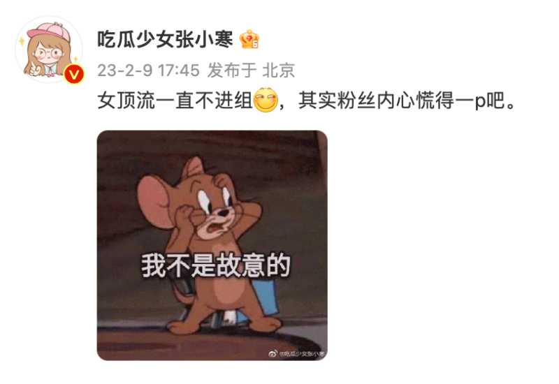 2月9日17:45,狗仔张小寒在社交平台发文:“女顶流一直不进组,其实粉丝内心慌得一p吧”。为迪丽热巴怀孕传闻,再添一把柴。