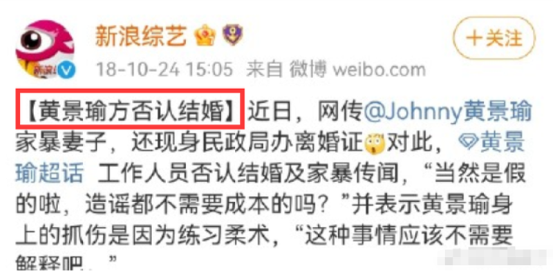 另外,当年黄景瑜方也明确否认结过婚,更否认网传家暴一事,还说这种事情不需要解释,而当时黄景瑜身上的抓伤工作人员表示是练习柔术导致,不是家暴留下的伤痕,王雨馨的妹妹也公开了被家暴后的照片。