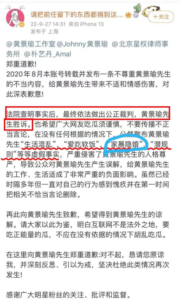 另外,有粉丝也解释,说黄景瑜曾多次打赢官司,对方道歉信中也明确点明,黄景瑜家暴隐婚是虚假事实,所以这件事真的真相究竟是怎样的呢?