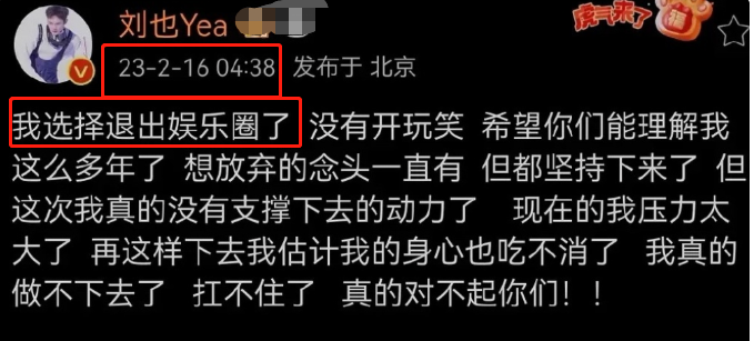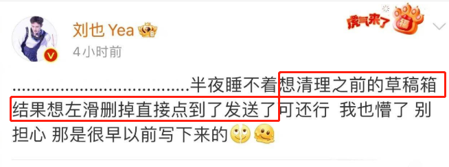 等刘也睡醒之后,才发现自己已经退圈了,连忙澄清自己只是手滑,把草稿箱里的内容发出来了。