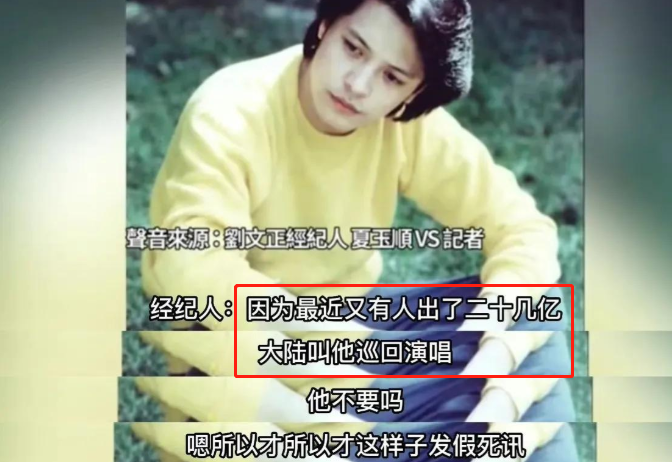 当记者问到刘文正的假死原因时,夏玉顺表示大陆有人出了20亿让刘文正巡回演唱,但他不愿意,就委托经纪人放消息说自己去世了。
