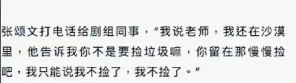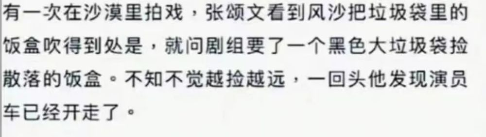 根据张颂文的自述,自己曾经有一部戏是在沙漠里面拍摄的,拍摄结束了剧组就打算一走了之,丝毫不顾风沙将吃过的饭盒吹得到处都是、弄得现场一片狼藉。而当张颂文要来塑料袋将饭盒收捡起来时,剧组甚至连车都开走了。