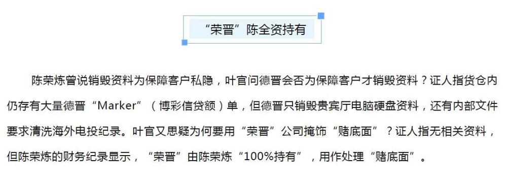 关于德晋集团存在“赌底面”的说法,从目前的审理情况来看,陈荣炼的财务记录的确存在向台北转账的证据(安以轩娘家),并且德晋也销毁了贵宾厅的电脑硬盘资料,但能否证明陈荣炼存在违法的行为,法院还在审理之中。