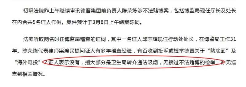 尤其是邱志辉现任行动处处长,在博监局工作31年。陈荣炼代表律师梁瀚民提问证人有多年稽查经验,有否收到投诉或检举德晋关于“赌底面”及“海外电投”?证人表示没有,指大部分是卫生局转介违法吸烟,无接过不法赌博的检举,亦无巡查到相关情况。