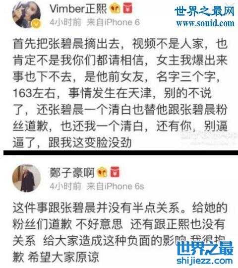 视频中的男主角虽然就是郑子豪,不过这女主角却不是张碧晨而是郑子豪的前女友。是两人此前在交往的时候拍的。而这几段不雅视频的发布者也正是这位郑子豪的前女友。视频拍摄于1年前,前任疑似因为嫉妒郑子豪另交新欢发布视频报复。