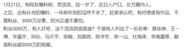 另外,之前也有爆料说,男顶流孩子已经一岁了,近日入户口,女方是圈内人,还补充说这位男顶流的粉丝有3000万,在列出的名单中,蔡徐坤也符合这个条件。