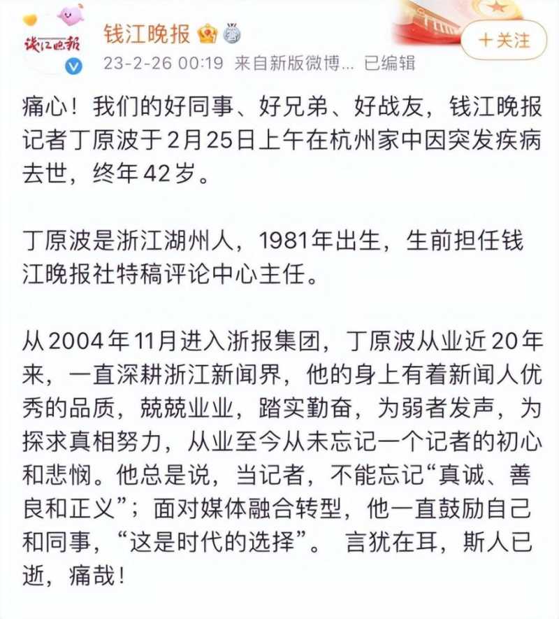 2月25日,钱江晚报对外发布了一则悲痛消息,钱江晚报记者、知名媒体人丁原波于2月25日上午在杭州家中因突发疾病去世,年仅42岁。