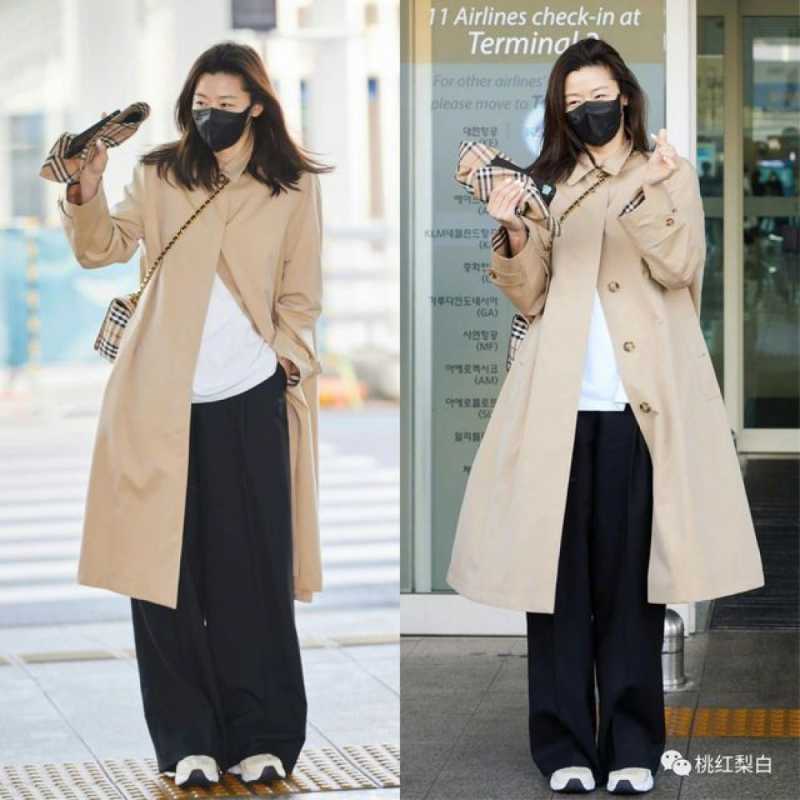 之前机场的这一身长风衣X宽松阔腿裤的Look,也颇受好评。