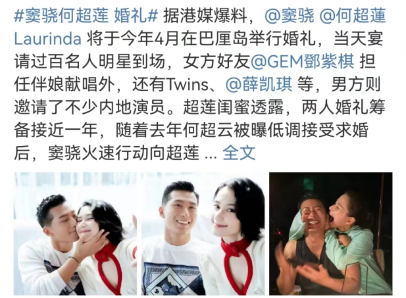 港媒爆料,窦骁嫁何超莲4月在巴厘岛举办婚礼,女方疑似怀孕