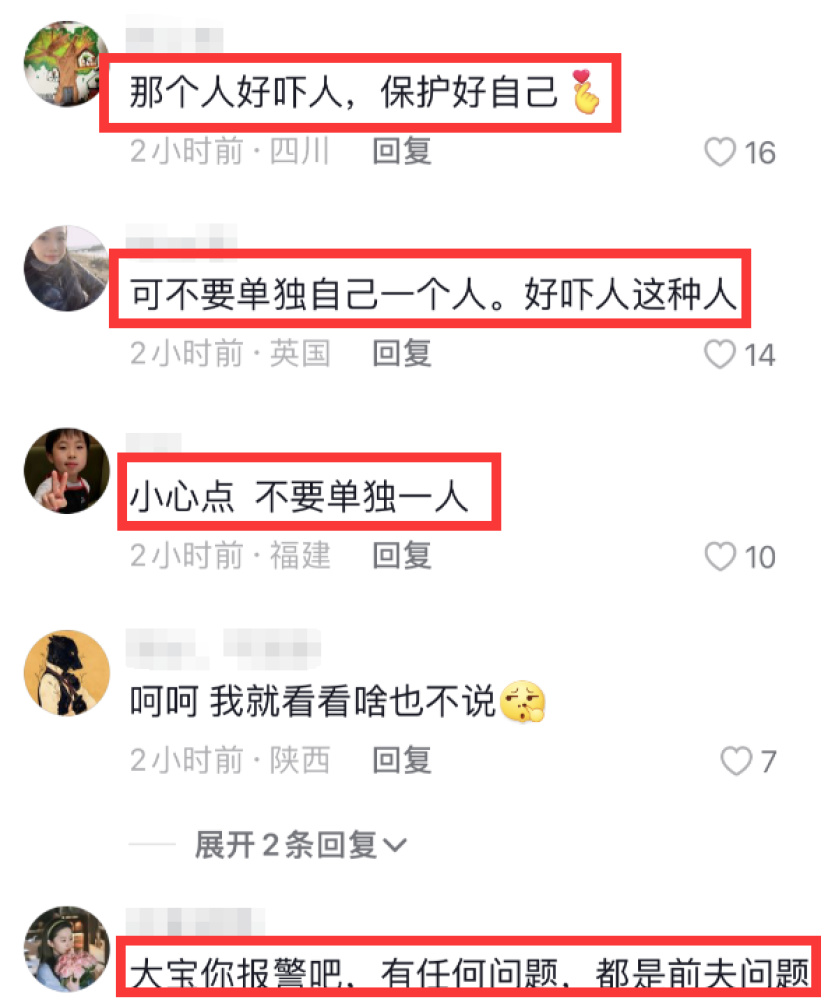 不少网友看到徐大宝公开的视频后,纷纷留言说她前夫太可怕了,也都提醒她注意安全,保护好自己千万别单独一个人,还让她不要暴露自己的位置。