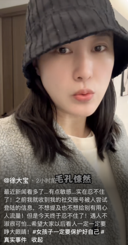 3月1日一早,曾遭丈夫家暴的演员徐大宝更新动态,讲述了自己近期令人毛骨悚然的经历,结合近期发生的骇人案件,可以看出徐大宝也生怕遭到前夫的打击报复,从而对自己的人身安全产生隐患。