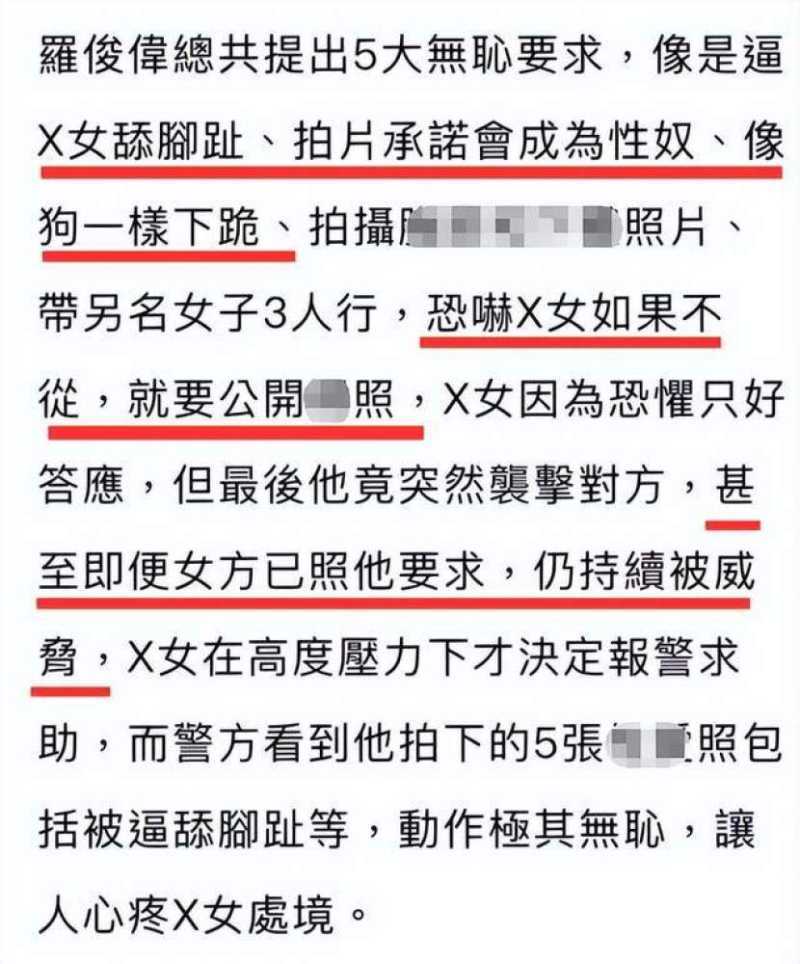 从受害女子口中可以得知,罗俊伟在私生活方面相当“重口味”,曾向其提出过5点无耻且荒唐的要求,比如让女方舔脚趾、像狗一样下跪,拍摄女方私密照,倘若女方拒绝,他便会公开之前准备好的私密照片。