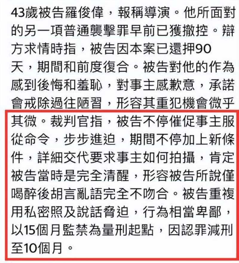在庭审中,罗俊伟对他的所作所为感到后悔和羞耻,对事主感到歉意,承诺会戒掉过往陋习,形容其犯罪机会微乎其微,而法官认为,罗俊伟在要求对方如何拍照片时是完全清醒的,与他所说仅仅是喝醉后胡言乱语完全不吻合,他重复用私密照威胁,行为相当卑劣,以15个月监禁为量刑起点,因为认罪故减刑至10个月。