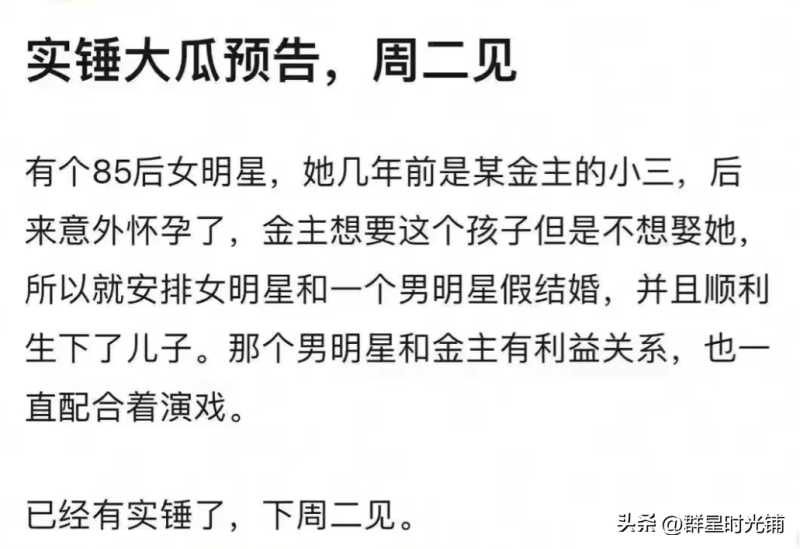 85花怀了金主的孩子,金主想要孩子,却不想离婚娶她,于是安排了一个男演员跟她假结婚,生完儿子就离婚。这个瓜似乎比较保真,爆料人说下周二就会放锤,到时候将真相大白于天下。