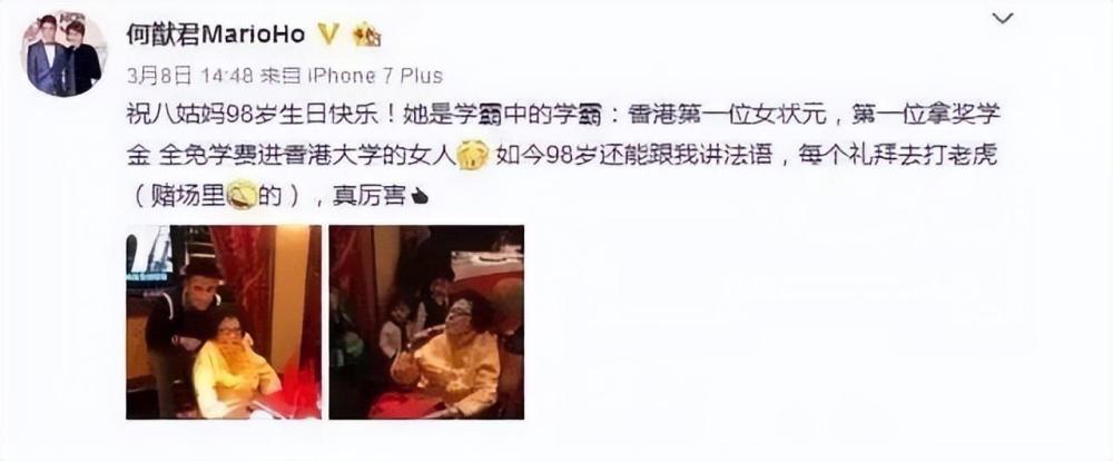 翻看何猷君的账号,他之前经常分享八姑妈的日常,他透露何婉鸿是学霸中的学霸,是香港第一位女状元,第一位拿奖学金,全免学费进香港大学的女人,98岁的时候还能讲法语,在何猷君心中,八姑妈是他学习的榜样,不得不说,何婉鸿也确实是家族之光。