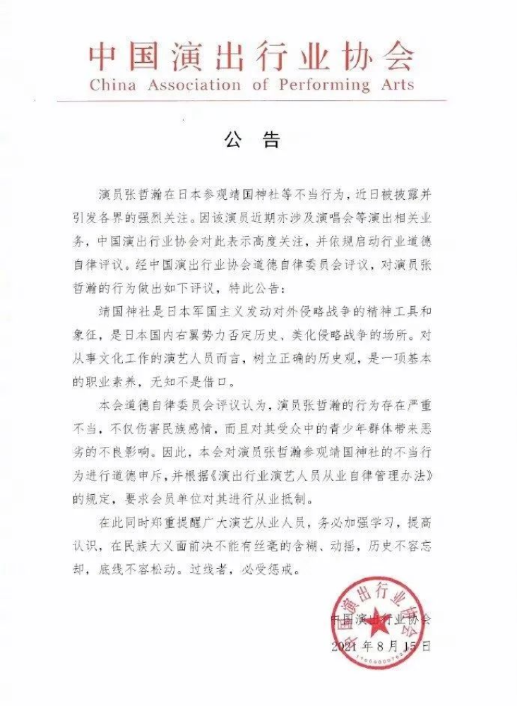 性质恶劣,官方媒体点名批评,张某瀚掉光十多个代言,最终中国演出行业协会下发了红头文件,明确声明:对演员张哲瀚参观靖国神社的不当行为进行道德申斥,根据相关规定,要求会员单位对其进行从业抵制。