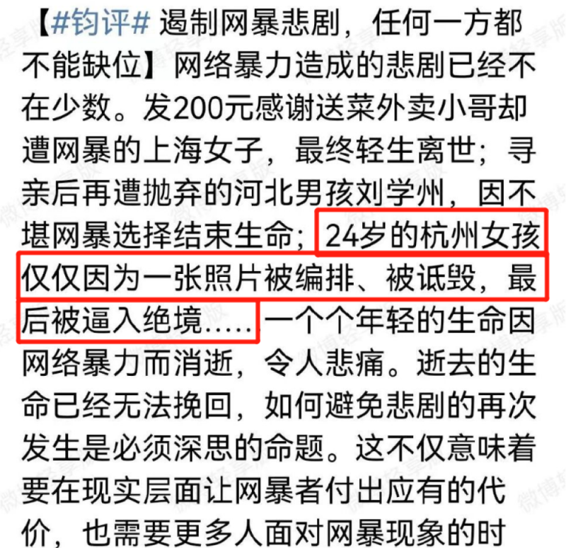 媒体人为此发声,例举社会中几大网络暴力事件,希望引发大家的反思。