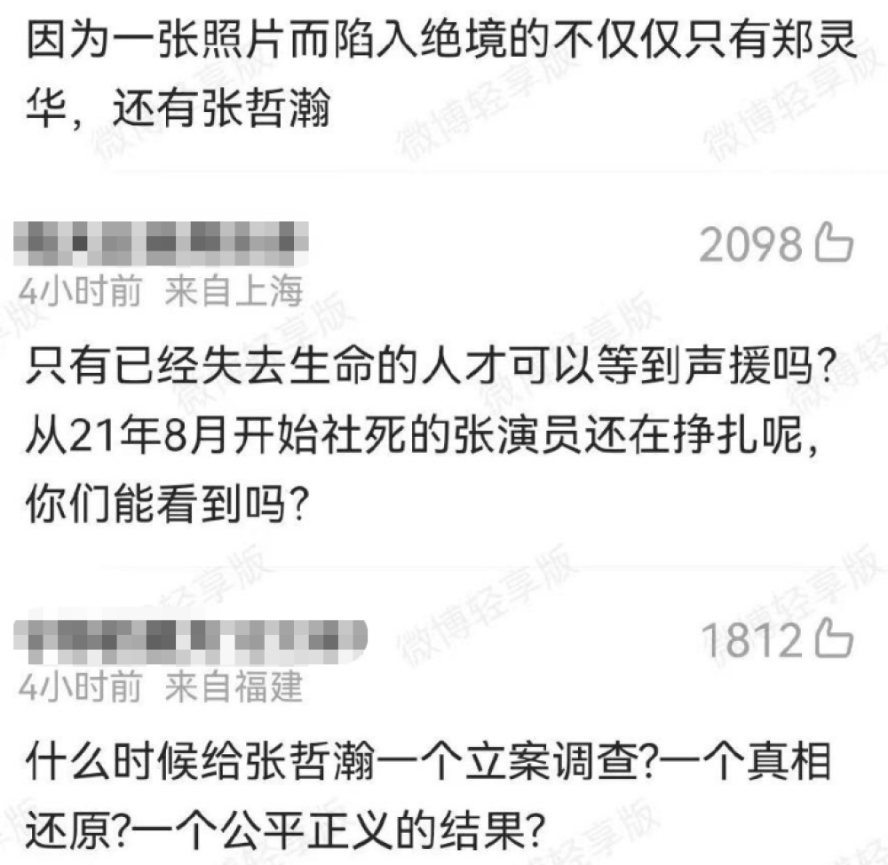 可惜评论区并不是什么正向的探讨,而是张姓劣迹艺人粉丝的组团控评。他们成批为自己的偶像喊冤:“因为一张照片陷入绝境的,不仅仅只有郑灵华,还有张某瀚!”