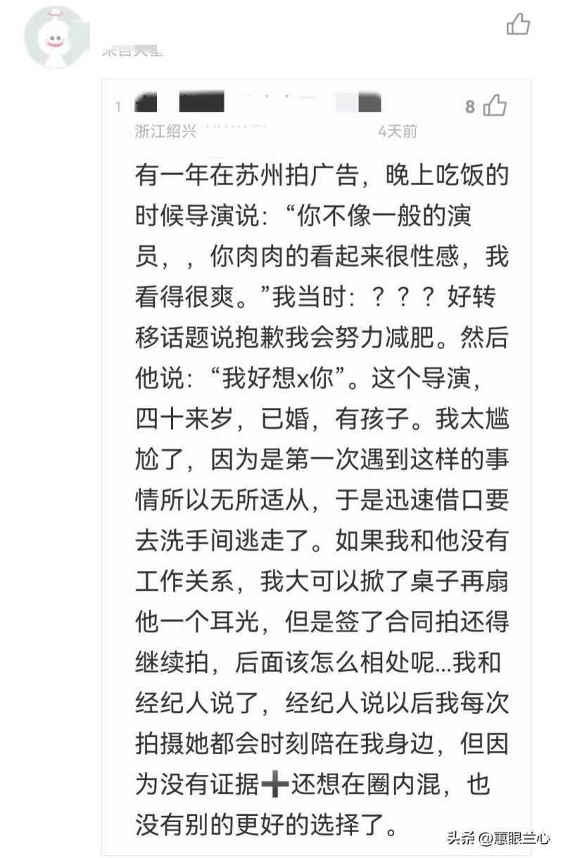 还有一位广告模特爆料:有一年自己在苏州拍广告,吃饭的时候导演说:“你不像一般的演员,你肉肉的看起来很性感,我看着很爽”,当时我想转移话题,没想到,他直接就说:“我很想X你”,这个导演40多岁,已经结婚,还有孩子。当时我太尴尬啦,不知道如何是好,最后找了个去洗手间的借口逃啦。后来因为签了合同,也只能硬着头皮拍完,但是还想在圈里混也就没有更好选择。