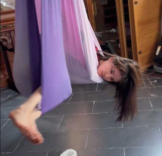 5.近日,朱丹妮在网上发布了一段视频,画面里她正在练习空中瑜伽,体态优美自然,动作也非常优雅。