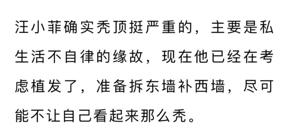 仔细想来,汪小菲当下不过41岁,正值男人的壮年阶段,这个年纪就出现“斑秃”的情况未免有些奇怪,为此有其他瓜主透露,汪小菲之所以“斑秃”与其私生活不自律大有关联,考虑到形象问题,汪小菲下一步会考虑植发,暂且只能拆东墙补东墙,勉强挽回点自己的形象分。