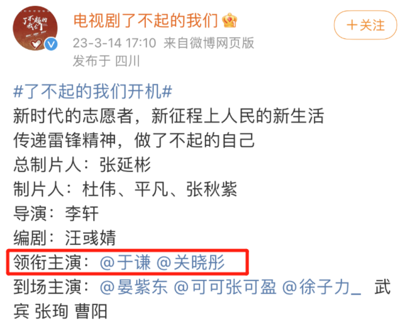 事情是这样的,于谦和关晓彤合作的新剧《了不起的我们》开机,官博放出开机照的同时也公布了主演配置。领衔主演那一栏里,于谦和关晓彤并列,说明两人就是这部剧的男女主了。