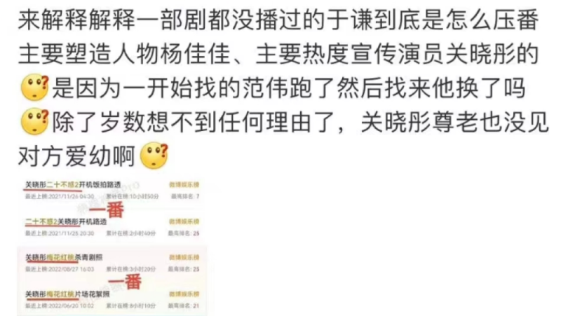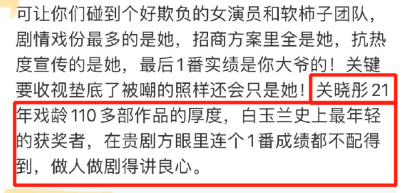 他们认为关晓彤应该作为一番的理由,也说的头头是道。比如“54岁的于谦虽然年龄大,但一部剧都没播过,他就是一个十八线都排不上的主演”。“关晓彤尊老,却没看见他爱幼啊!”