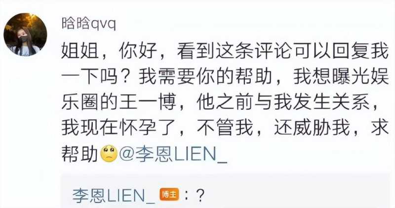 3月16日,顶流王一博登上热搜榜单,一位名叫“晗晗”的网友直言与王一博发生关系并怀孕,男方对她不管不问甚至还威胁她,最终无奈网上求助,希望能够得到帮助。