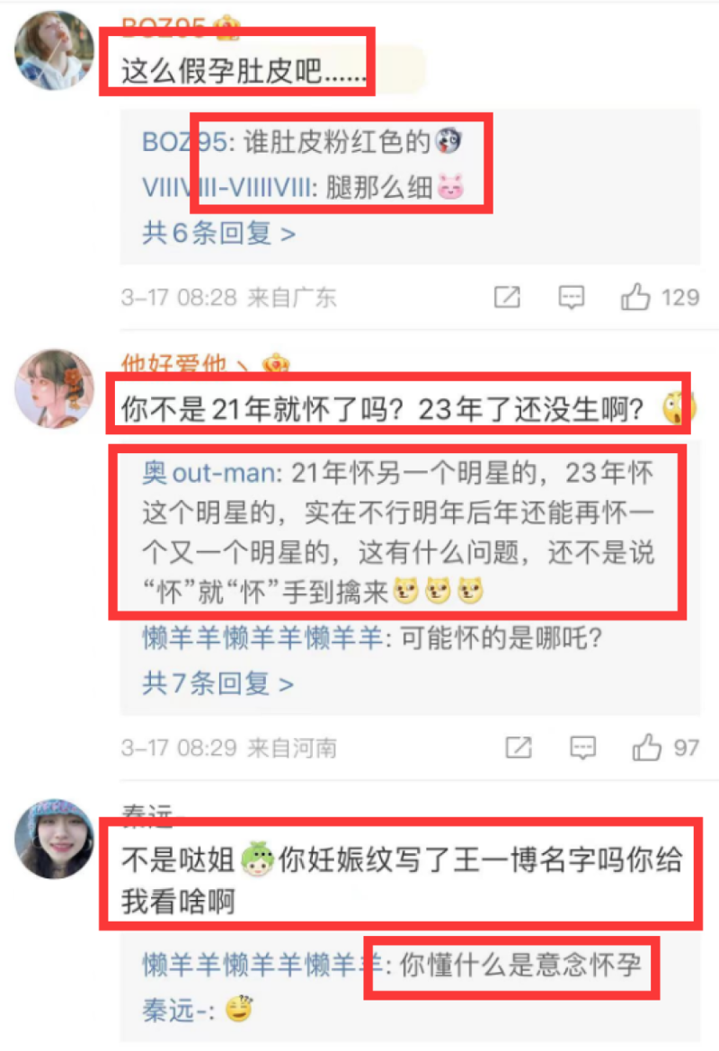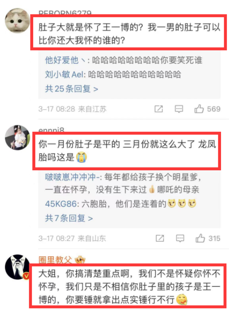 可这个视频中,当事女生没有露脸,而且肚皮还是粉色的,很多人质疑肚皮为什么会是粉色,还有人质问她“肚子大怀的就是王一博的”?理智的网友则表示大家不是质疑她有没有怀孕,而是证明自己怀的是王一博的,让她拿出实质性的证据,这样大家才能相信她。