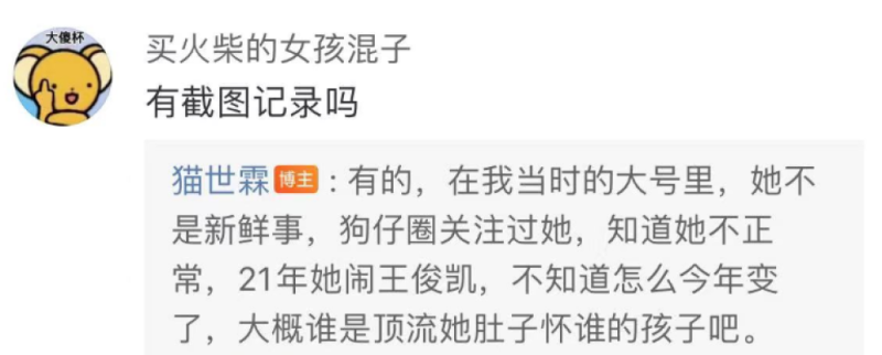 就在大家就此事争论不休之际,一位叫作“猫世霖”的网友爆料,这位名叫“晗晗”的女子早在21年就曾找过她,而当时“晗晗”自称自己腹中怀上了王俊凯的孩子。
