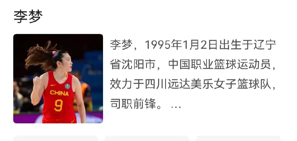 李梦是1995年出生的,是中国女篮明星球员,曾是八一女篮成员;战绩非常耀眼,在女篮中是核心般的存在: