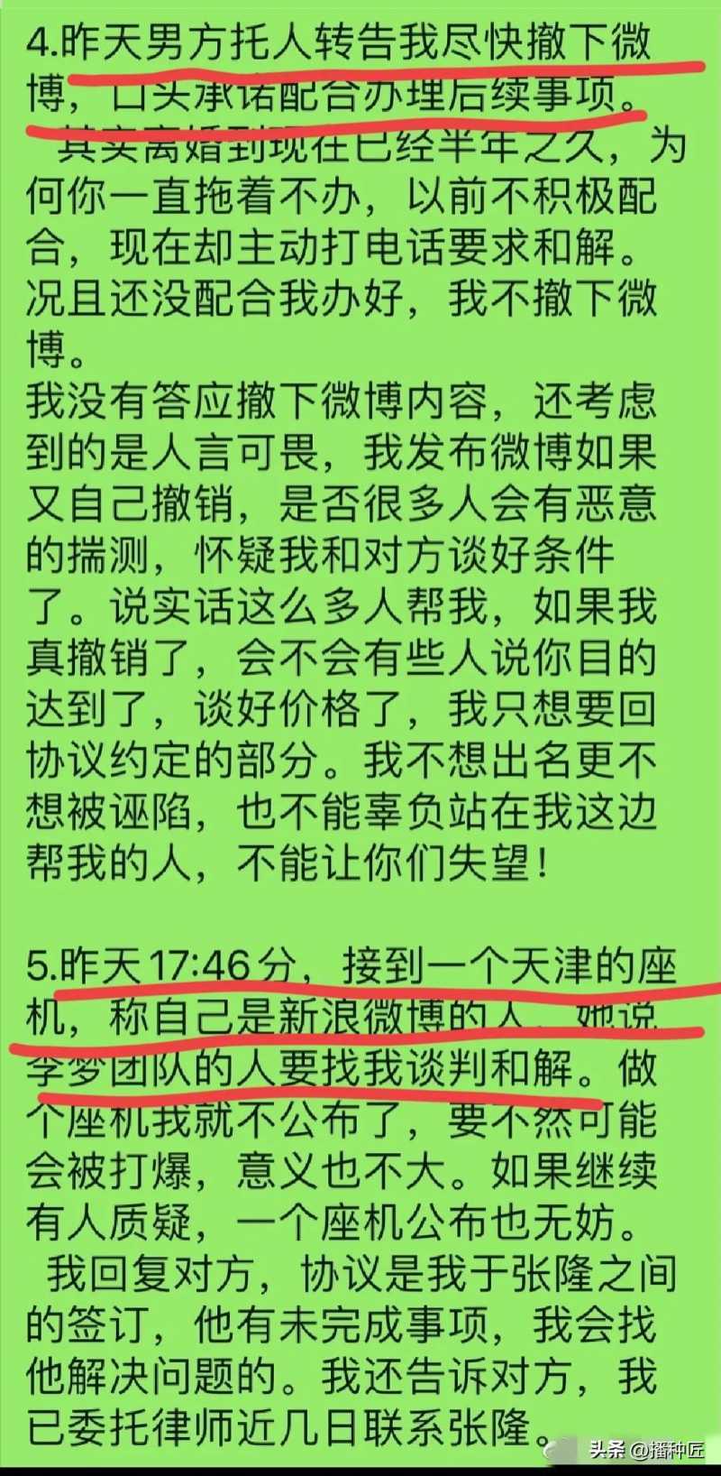 3月19日,张隆前妻报料了事件的最新进展,疑似张隆要求女方撤下网上内容,口头上答应房子过户及支付抚养费等事宜。但是女方坚持没有办好前,不撤下内容,并透露李梦团队的人也要谈判和解。