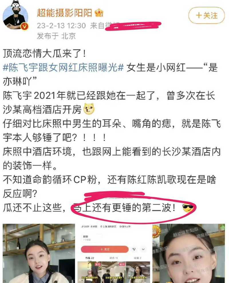 翻看狗仔阳阳的照片,他就是在2月13日的时候,发布了陈飞宇和女粉丝睡觉的床照,也就是这一天,内地娱乐圈大地震,陈凯歌的儿子陈飞宇从当红演员,变成了私生活有问题的翻车艺人。