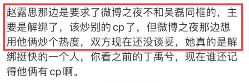 此外,还有传闻说赵露思不去微博之夜只是为了避免与吴磊碰面,毕竟两人合作后,其CP粉团队也是日益壮大,鉴于此次吴磊与赵露思都在微博之夜的受邀名单中,两人总避免不了要同台,所以赵露思方最终决定放弃这次活动邀约,就是不想两人同框。