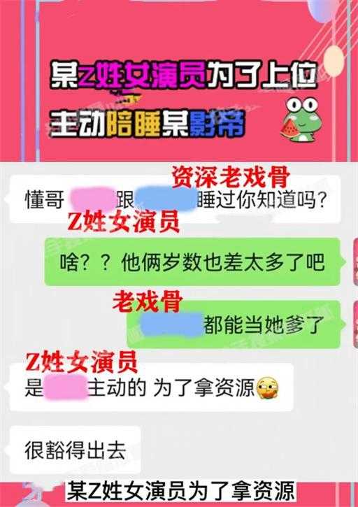 在懂瓜呱的爆料中,这位Z姓女演员为了拿到娱乐圈的资源,主动跟年纪能当她爹,且有着“影帝”称号的资深老戏骨睡过。关键是老戏骨结婚都好几十年了,儿女年纪也不小,和女演员为了资源、欲望乱搞,丝毫不在意个人形象。这名女演员和老戏骨的牵扯源自于几年前一同拍摄的某部民国剧,当初拍摄完成后一直就没断过联系。