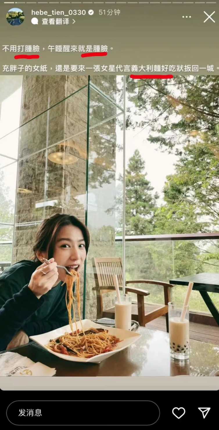 这个图片才刚冲上热搜,她紧接着就在微博上再次发表了一段似是而非的奇怪言论和自己吃意大利面的配图。全文声称不用打肿脸,睡一觉起来脸就是肿的,并且还配上了自己吃意大利面的照片,还有最后那四个醒目地扳回一城。