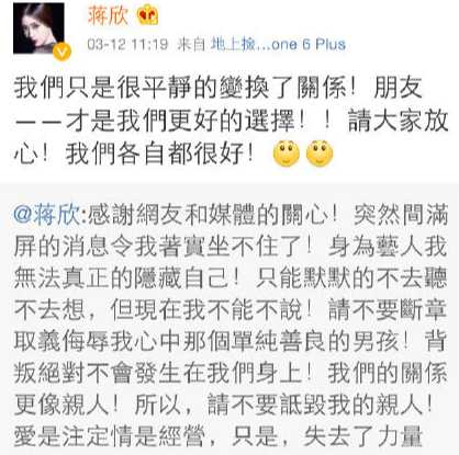 但是蒋欣却发文称两人和平分手,没有劈腿一说。