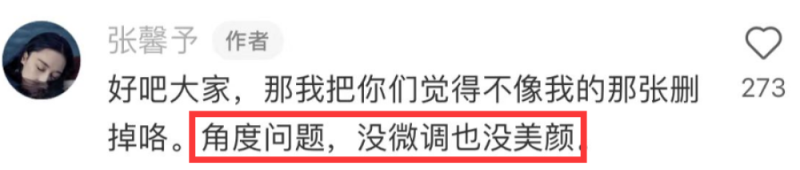 对于网友们的质疑,张馨予本人在评论区予以回复,表示自己已经自行删除了引发争议的那张照片,并明确表示自己没有微调,也没有使用美颜滤镜,完全是因为角度问题才会使得拍摄成片不像自己。