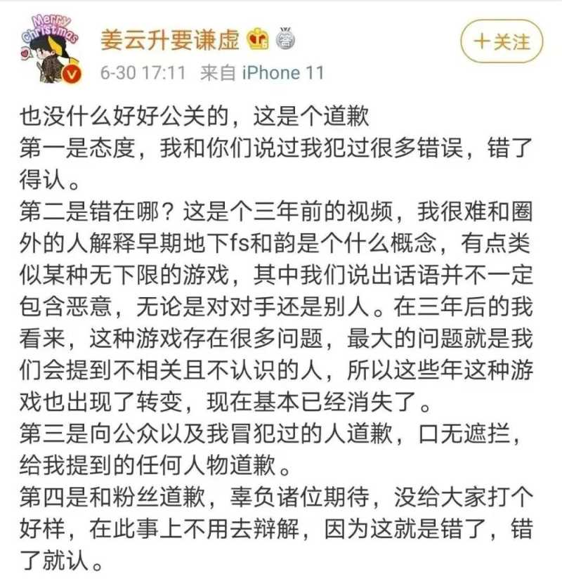随后姜云升也发布了道歉,承认了自己的错误,但他强调这是说唱圈早期的游戏,自己本身是没有恶意的。可是就算是再早期,作为一个具有理智的成年人,能够说出这样的话,还是因为自己本身的素质教养就根本不过关。