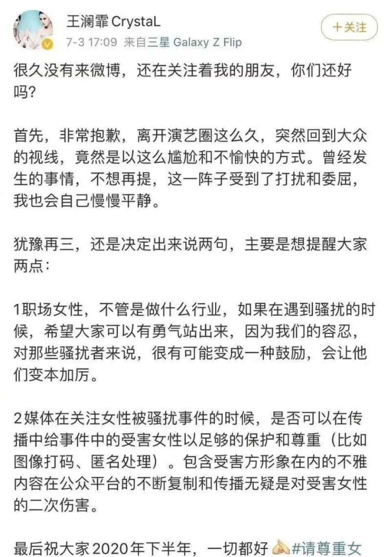 虽然导演表示这是因为喻恩泰有些拘束,综艺感不太好,可是女演员王澜霏直接发文称希望大家在面对骚扰时能够勇敢地站出来。