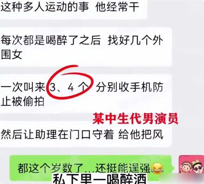 同时,爆料者指出,这个男演员一喝醉酒就开始找外围女,并且每一次都会找三四个,搞多人运动,私生活十分的混乱,并且经常都会要求自己的助理在门口把风。为了谨慎起见,这名男艺人在床上就会没收每个女子的手机,禁止他们拍摄。