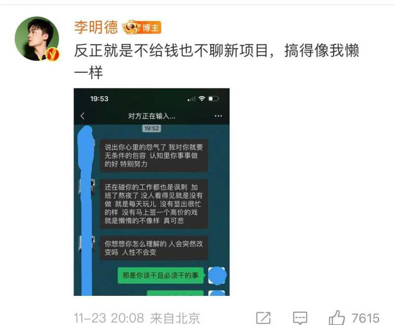 11月25日,小有名气的演员李明德突然发文,内容是找人讨债、说有人拖欠他工资不给,而且是他这一整年的收入、拿不到钱就揭不开锅啦!