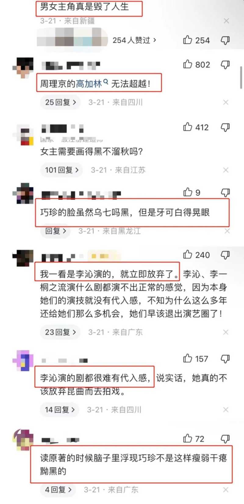 两位主演虽然为贴合角色画了黑脸,但他们说着普通话,李沁的大白牙太出戏,陈晓不如周里京演绎的高加林经典,这就让观众觉得没有代入感。