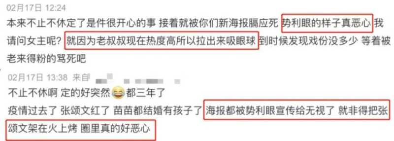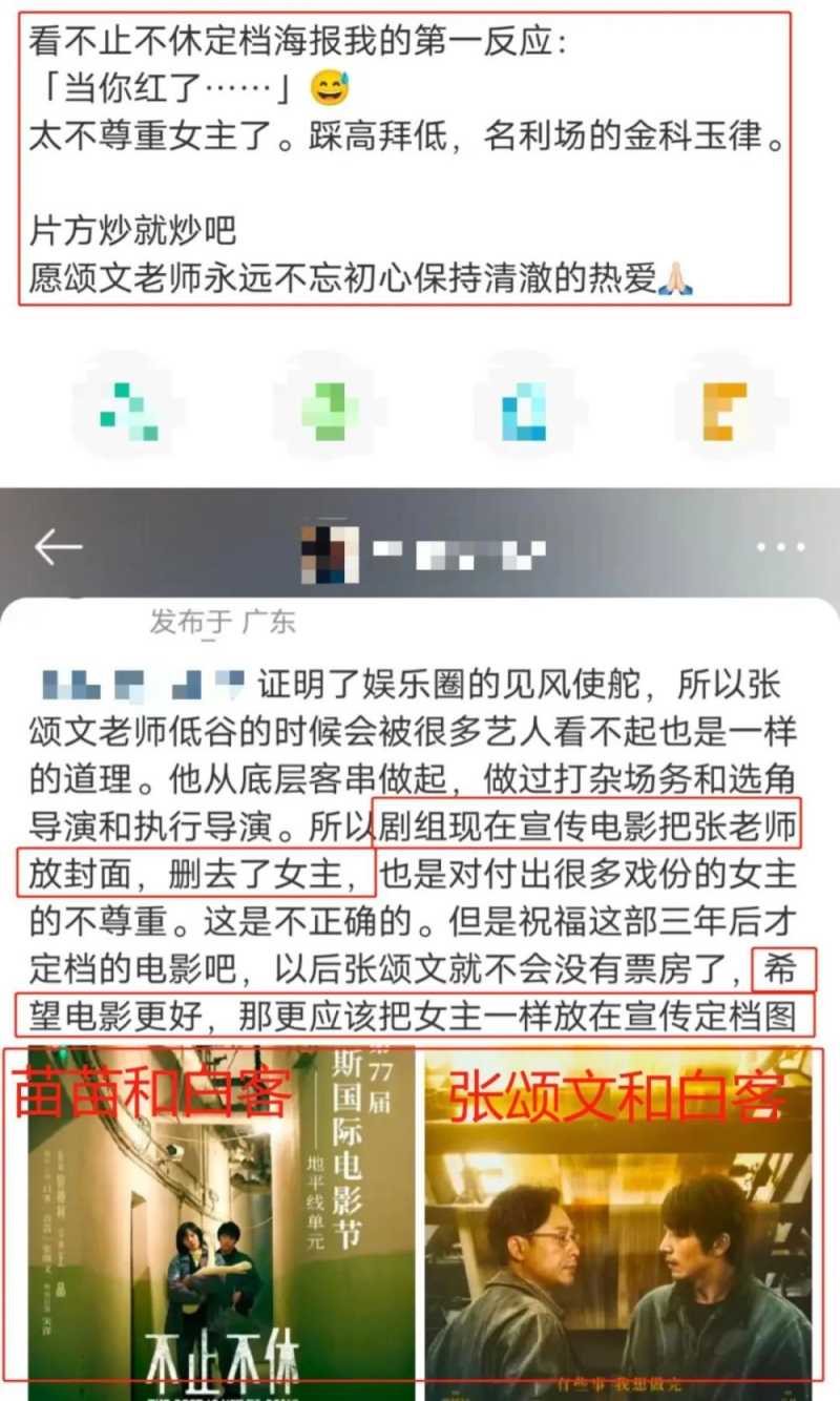张颂文粉丝质疑,片方就是在“踩低捧高”,把女主苗苗的定档封面宣传图删了。