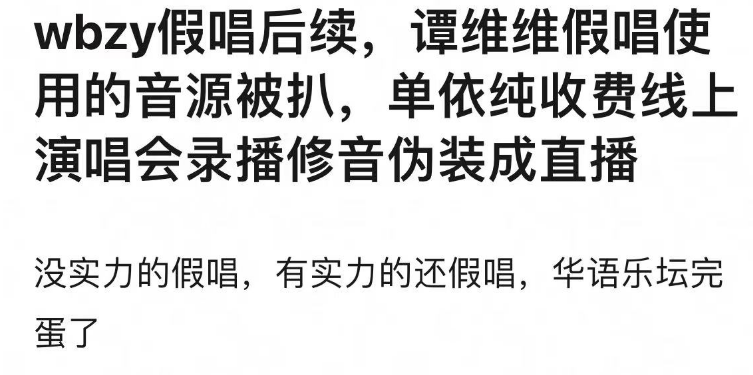 需要唱跳RAP的蔡徐坤都开麦真唱了,虽然垫了些音,但也是真开了口的。号称“国家队”的谭维维,怎么就变得那么难开口了呢?