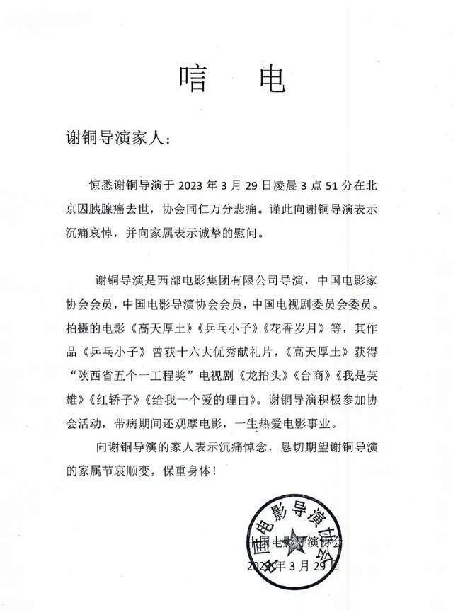 3月29日,知名导演谢铜因为罹患胰腺癌在北京病逝。