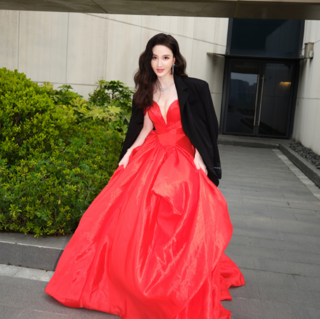 她选择了一袭红色大摆裙,衬得她肤白如雪,深v的领口更是凸显好身材。