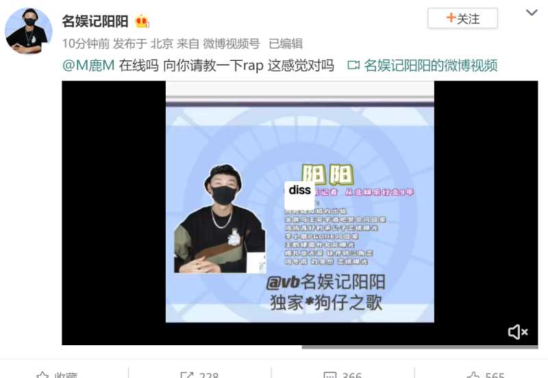 娱记阳阳直接发文,分享了一段吐槽的rap,重点他还艾特了鹿晗,指向性简直不要太明显了。