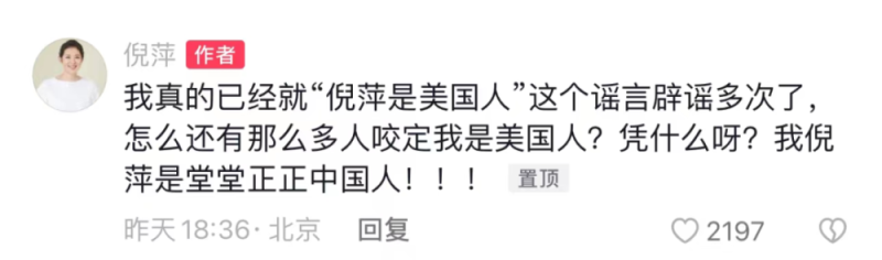 64岁的倪萍在评论区激动回应,表示自己对“倪萍移民美国”的言论已经辟谣多次,不明白为什么到现在还有网友会相信,还质问自己凭什么还被那么多人咬定的美国人,她是堂堂正正的中国人。